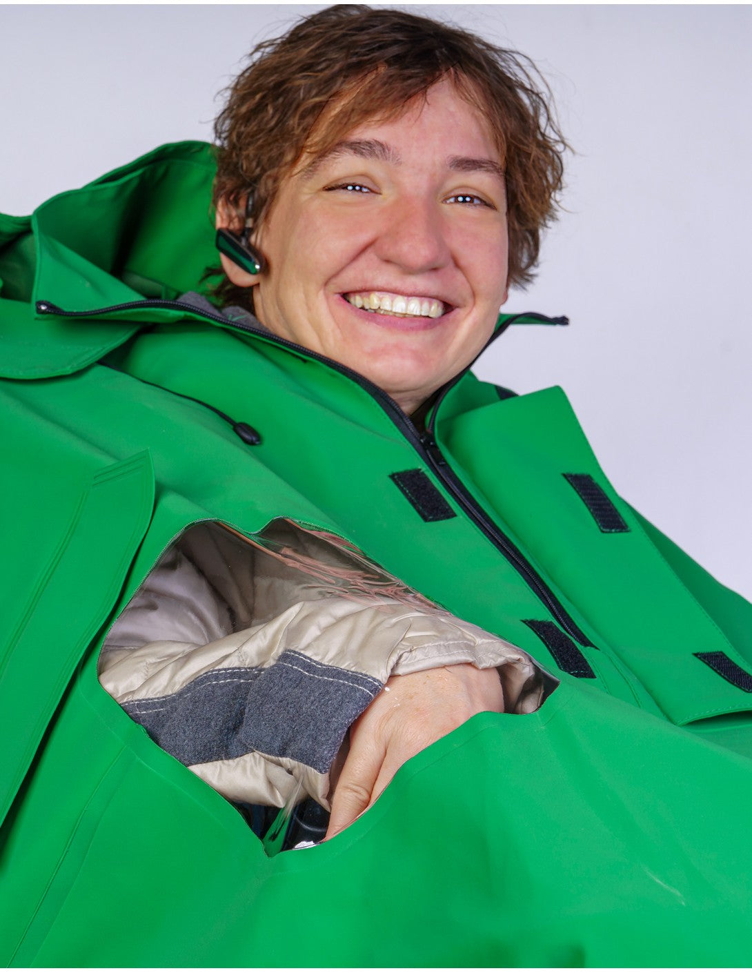 - Capuche avec une visière, ajustement velcro à l'arrière et des stoppeurs élastiqués à l'avant.