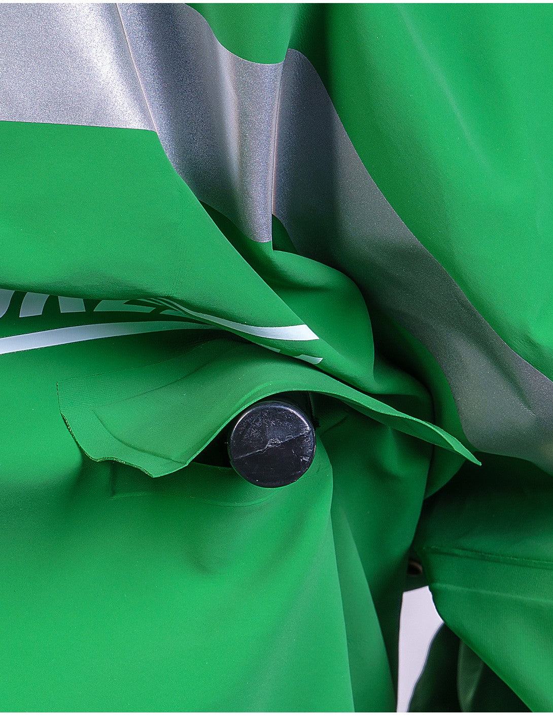 - Capuche avec une visière, ajustement velcro à l'arrière et des stoppeurs élastiqués à l'avant.