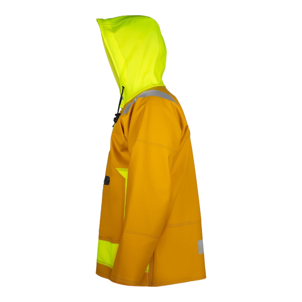 Cette vareuse est fabriquée dans un tissu technique de haute qualité. Le Polyester est renforcé par une double enduction de PVC, ce qui la rend non seulement totalement imperméable, mais aussi particulièrement résistante à l'abrasion et aux déchirures. Sa souplesse vous offre une grande liberté de mouvement, un atout indispensable pour les manœuvres à bord ou les activités de pêche.